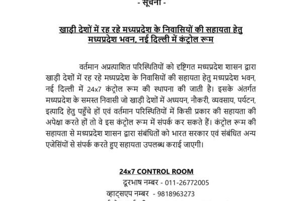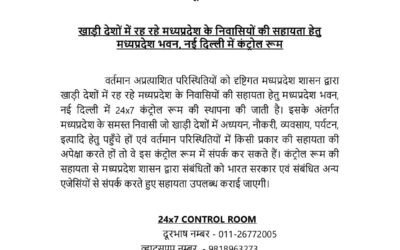 खाड़ी देशों में रह रहे मध्यप्रदेश के निवासियों की सहायता हेतु मध्यप्रदेश भवन, नई दिल्ली में 24×7 कंट्रोल रूम स्थापित