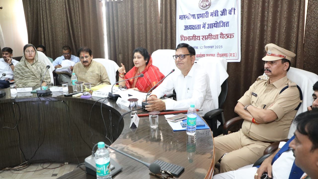 टीकमगढ़, 12 सितम्बर 2025/* मध्यप्रदेश शासन की पिछड़ा वर्ग एवं अल्पसंख्यक कल्याण, विमुक्त घुमन्तु अर्द्धघुमन्तु कल्याण विभाग राज्यमंत्री (स्वतंत्र प्रभार) एवं टीकमगढ़ जिले की प्रभारी मंत्री कृष्णा गौर की अध्यक्षता में आज कलेक्ट्रेट सभाकक्ष में शासन की योजनाओं/कार्यक्रमों की समीक्षा बैठक अयोजित की गई। इस अवसर पर सरोज राजपूत, जिला पंचायत अध्यक्ष उमिता राहुल सिंह, टीकमगढ़ विधायक यादवेन्द्र सिंह बुन्देला, खरगापुर विधायक चंदारानी गौर, सांसद प्रतिनिधि विवेक चतुर्वेदी, पूर्व मंत्री राहुल सिंह, पूर्व विधायक टीकमगढ़ राकेश गिरि गोस्वामी, पूर्व विधायक पृथ्वीपुर डॉ. शिशुपाल सिंह यादव, जनपद पंचायत जतारा अध्यक्ष रेखा महेश यादव, अन्य जनप्रतिनिधि सहित कलेक्टर विवेक श्रोत्रिय, पुलिस अधीक्षक मनोहर सिंह मंडलोई, जिला पंचायत सीईओ नवीत कुमार धुर्वे तथा संबंधित अधिकारी उपस्थित रहे।